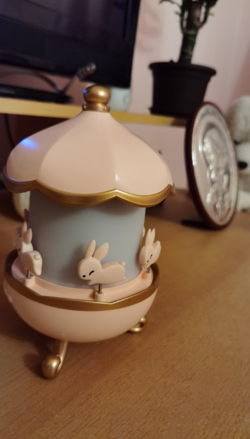 Caruselul e minunat, ii pun muzica de pe tel si danseaza, se uita pe pereti de atunci, cauta iepurasii proiectati